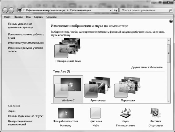 Тема – это совокупность настроек, которые регулируют общий внешний вид интерфейса операционной системы. Вы можете выбрать в окне Персонализация одну из семи представленных тем Aero или найти дополнительные темы в Интернете (для этого щелкните на ссылке Другие темы в Интернете, расположенной в этом же окне). Чтобы посмотреть, как выглядит тема, достаточно выделить ее. Все параметры сразу же применятся. Если полученный результат вас не устроил, просто выберите другую тему.
