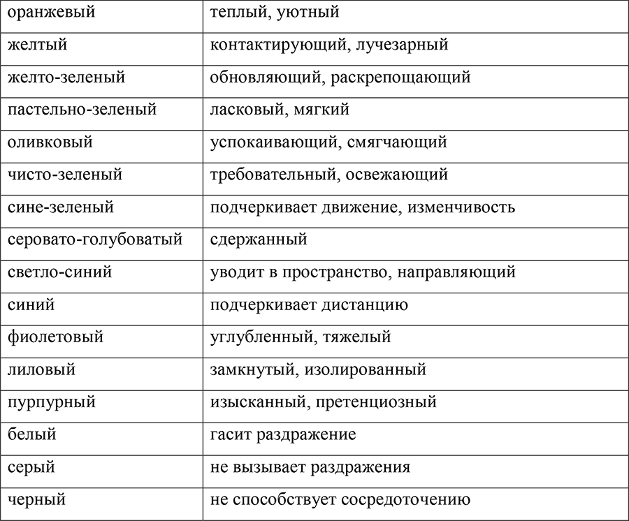 Таблица цветов (версия Российского института цвета):