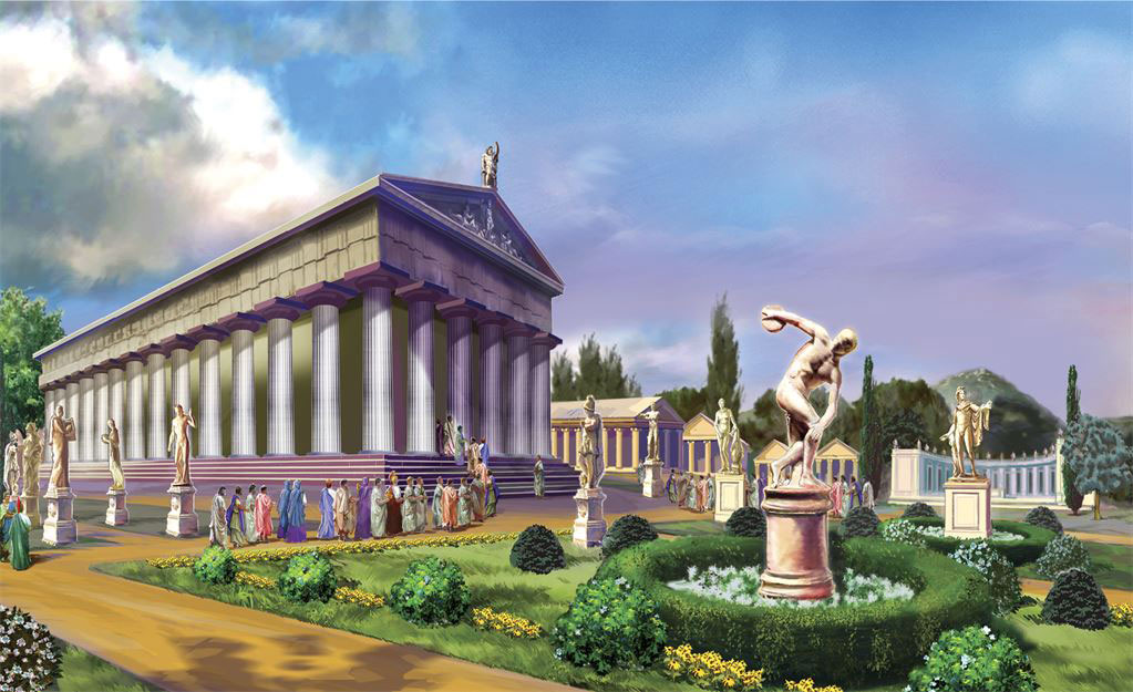Первые состязания спортсменов в Олимпии были посвящены верховному греческому богу Зевсу. Во времена первых Игр был построен посвященный ему храм. Рядом стояла сокровищница со скромными дарами. В первой половине V века до нашей эры, когда Игры из местных спортивных соревнований превратились во всегреческие состязания, этот храм было решено перестроить и сделать самым крупным во всей Греции. Для возведения этой величественной постройки деньги собирали со всех жителей Греции.