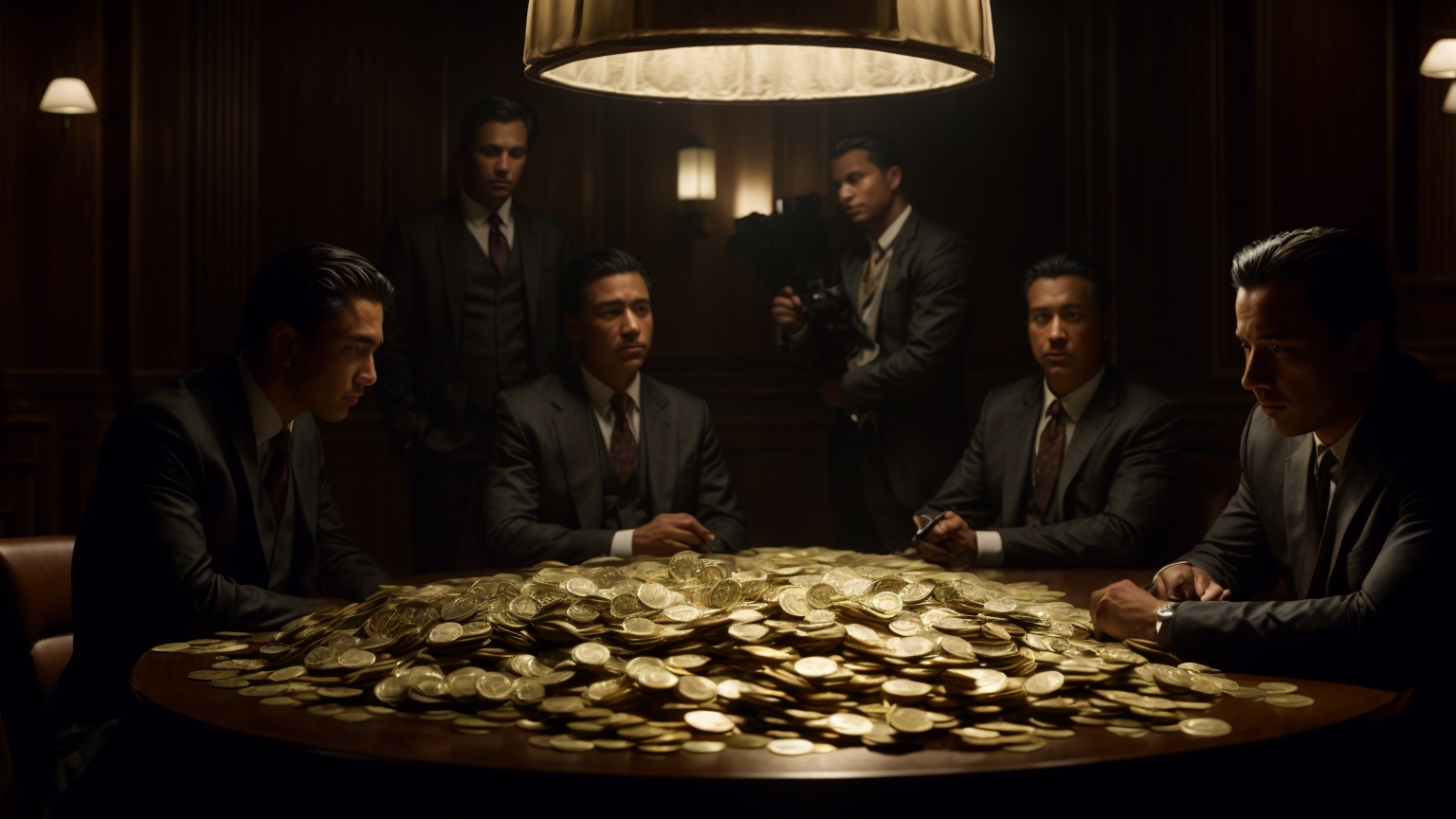 Тяжёлая металлическая дверь склада открылась, и Артём увидел внутри группу людей. Помещение освещалось лишь слабым светом одинокой лампы, свисающей с потолка. За круглым столом сидели четверо мужчин, их лица скрывались в полутьме, и лишь слегка поблескивали белки глаз. Стол был заставлен пачками купюр, металлическими кейсами и оружием, аккуратно разложенным на потёртой скатерти.