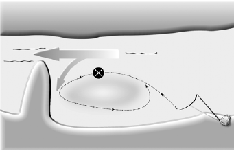 Рис. 57. Облавливается участок отмели, образованный перед мысом. Обозначено место приостановки проводки