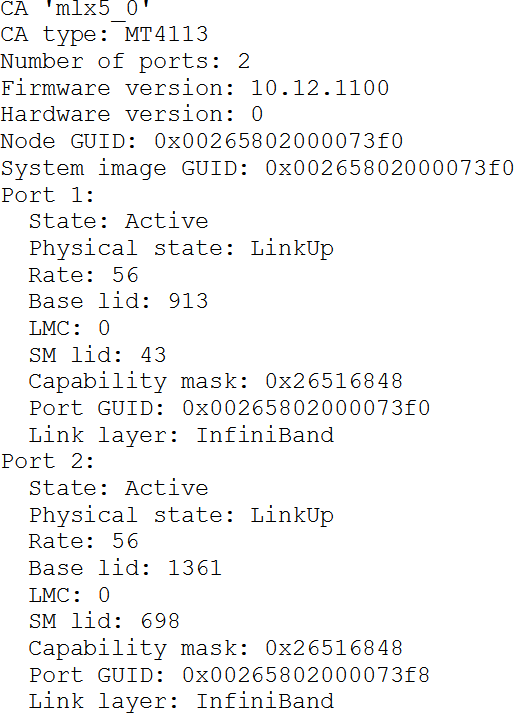 Для каждого порта в строке Link layer выводится тип подключения: InfiiniBand или Ethernet. Некоторые адаптеры InfiniBand позволяют подключаться как к сети InfiniBand, так и к Ethernet. Тип подключения определяется установленным трансивером. Строка Port GUID показывает GUID порта. Base lid – первый LID, присвоенный данному порту. Всего порту присвоено, как говорилось выше, 2LMC подряд идущих LID. SM lid – LID порта, на котором работает менеджер данной подсети. Rate – скорость передачи данных, на которой работает порт (56 в данном случае – это режим 4x FDR).