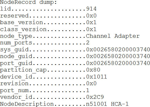 Иногда нужно узнать, какой машине назначен конкретный LID. Для этого можно применить утилиту smpquery. Вообще эта утилита предназначена для посылки пакетов управления подсетью SMP (Subnet Management Packet) и выдачи ответов в понятной человеку форме. В нашем случае нам нужен запрос описания узла (node description). Вот пример выдачи команды smpquery nodedesc 914 (запрос описания узла с LID 914):