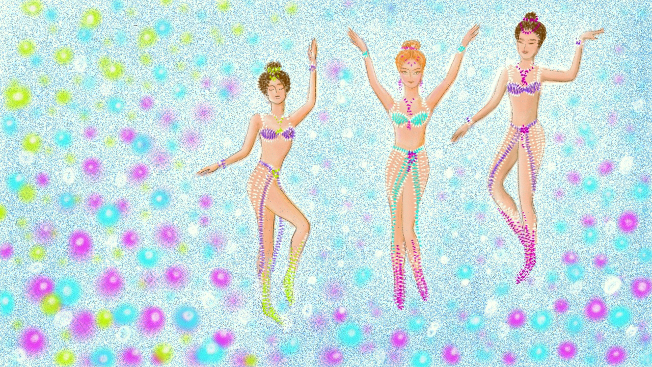 Скачок вверх. Висячие в небе замки с отделкой рубинами и бриллиантами, небесные танцовщицы в одеждах сотканных только из драгоценных камней пластично кружат и отстукивают своими прозрачными бриллиантовыми сапожками искря драгоценными камнями. Начинается дождь из брильянтов, изумрудов, сапфиров, рубинов.