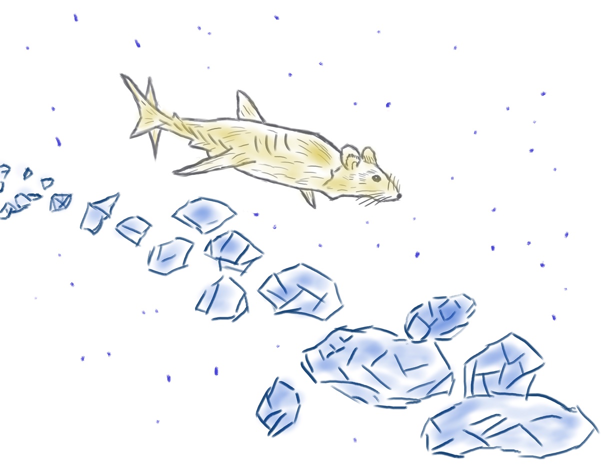Изучаю пространство вокруг. Я нахожусь в астероидном потоке. А эти существа здесь живут. Слева проследовало существо, напоминающее каракатицу, прозрачную, вспыхивающую коричнево-жёлтыми оттенками. Основная часть туловища громадная, за ним тянется хвост, похожий на нарезанные полоски мутно-коричнево-жёлтой ветоши. Далее проследовала стая более мелких сущностей, напоминающих акул с головами крыс. Рулевой плавник поднимался вверх в виде креста.