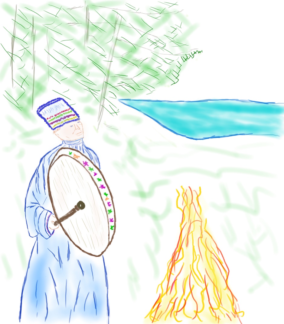 Смена динамической картинки. Шаман в ритуальной одежде танцует вокруг костра, издавая разные горловые звуки, и отбивает в бубен. Объединяем.