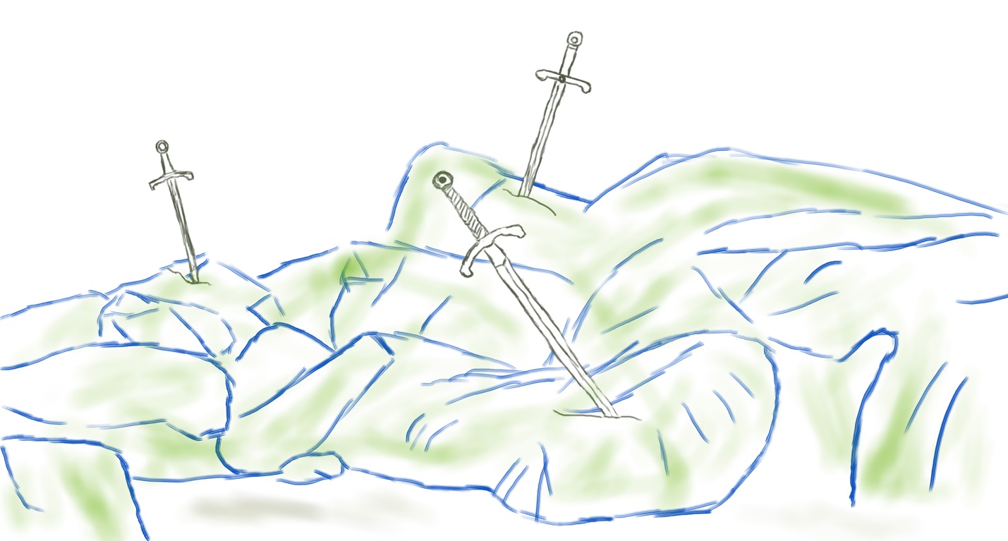 Продолжаю движение – впереди валуны с воткнутыми в них мечами. Насчитал пару десятков. Высота верхней части мечей в два роста человека. Попадаю в светло-синее пространство. Три существа, похожих на людей, сидят спинами друг к другу в позе лотоса в состоянии самадхи. По мере приближения к ним слышен гул – д-з-з-з-з. Чтобы были понятны размеры этих существ – ступня чуть меньше, чем рост человека (это примерно 1,5 метра только ступня).