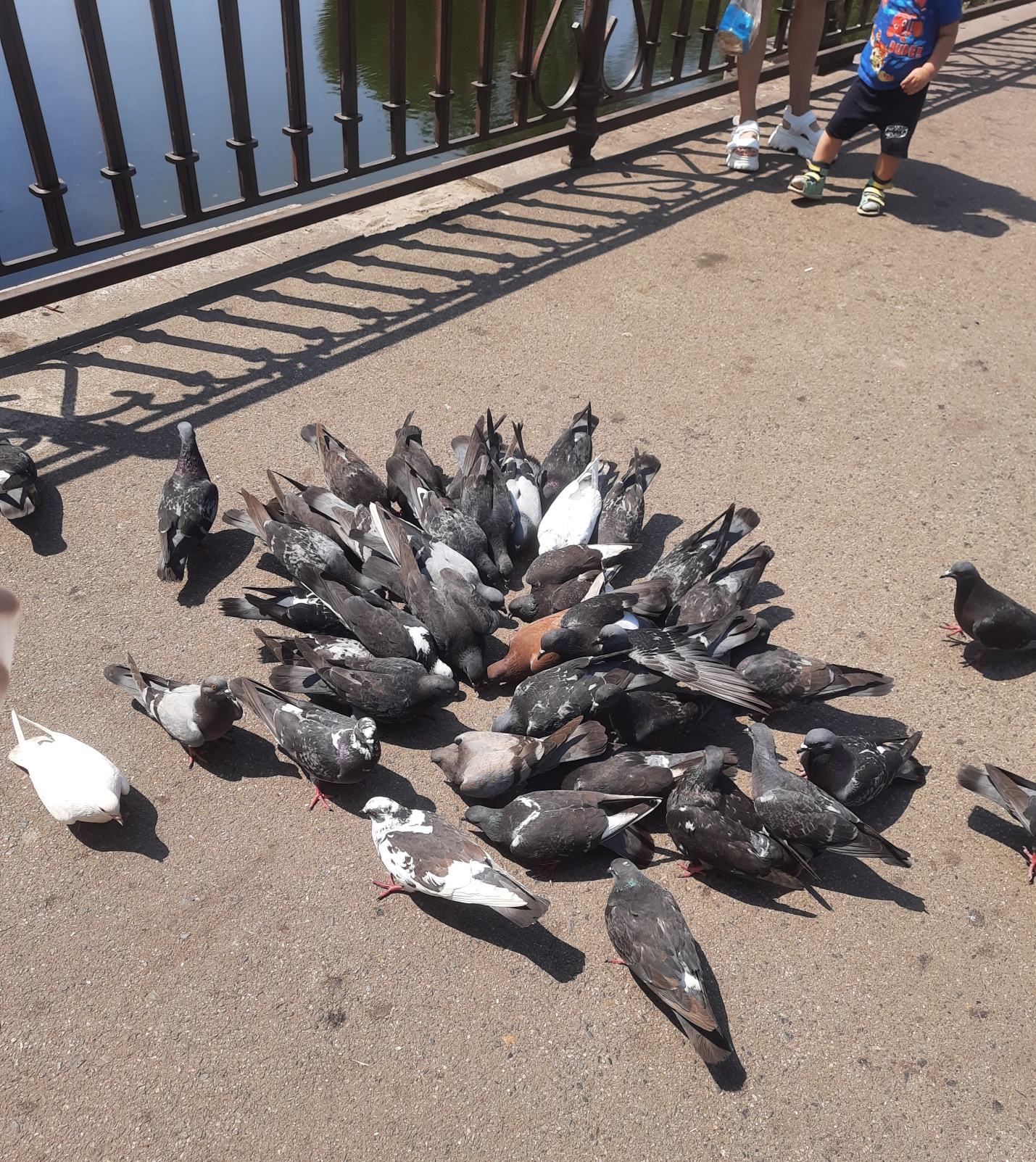 На аллее вдоль реки люди кормят голубей, воробьёв и уток (‘https://youtu.be/_ZznuznFE6g), которые выходят из воды даже к ближайшему кафе. К компании присоединилась также пара ворон.