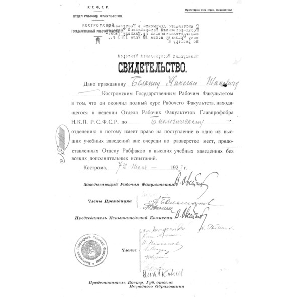 Дано гражданину Костромским Государственным рабочим факультетом в том, что он окончил полный курс Рабочего Факультета, находящегося в ведении Отдела Рабочих Факультетов Главпрофобра Н. К. П.Р.С.Ф.С.Р. по отделению и потому имеет право на поступление в одно из высших учебных заведений вне очереди по разверстке мест, предоставленных Отделу Рабфаков в высших учебных заведениях без всяких дополнительных испытаний. Белкину Николаю Ивановичу биологическому