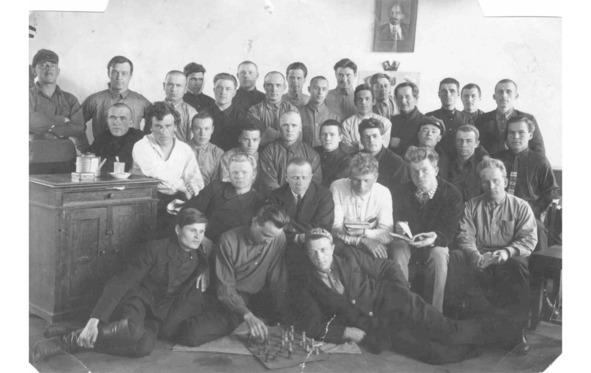 Н. Белкин – в первом ряду в центре с обритой головой. Омск, 1930-е.