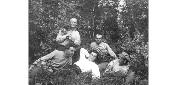 Вот еще три групповых фото, на которых Николай фотографировался в период, когда он обрил голову. На первой компания приятелей отдыхает в лесу. Николай – стоит слева. С ним во втором ряду в гимнастерке, скорее всего, – Сухарев. В центре в белой рубашке полулежа – видимо, Бодров.