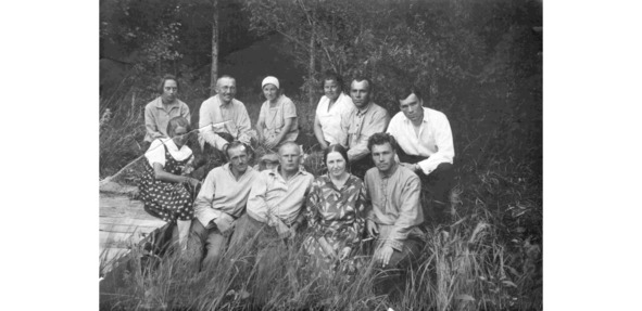 На второй фотографии, сделанной, похоже, в тот же день, компания расширилась. Глядя на лица можно предположить, что это не только студенты, но и преподаватели. Возможно, это какой-то коллективный кафедральный выезд «на природу». В архиве есть ещё одна фотография: в том же составе, но стоят шеренгой.