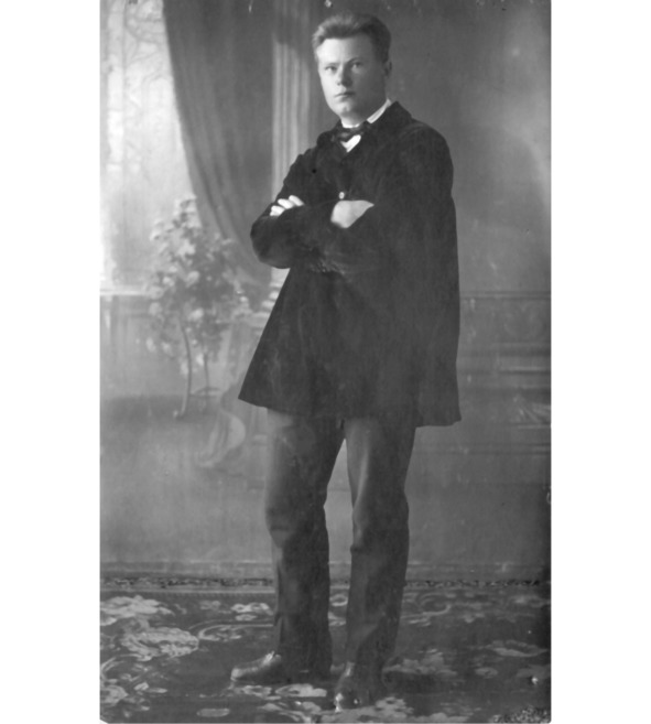 А вот фото, о котором следует сказать особо. Во-первых, это не групповое любительское фото, а профессиональный студийный фотопортрет во весь рост. Во-вторых, на обороте надпись: А в-третьих, здесь папочка в бархатном балахоне с бабочкой! Очень выразительная фотография… Впоследствии на мой детский вопрос – а зачем ты так одевался? – он отвечал, что в это время посчитал себя поэтом, художником. «На добрую память папе, маме и сестрам от сына и брата. Роспись (с росчерком). 1/VIII-26 года, Омск.».