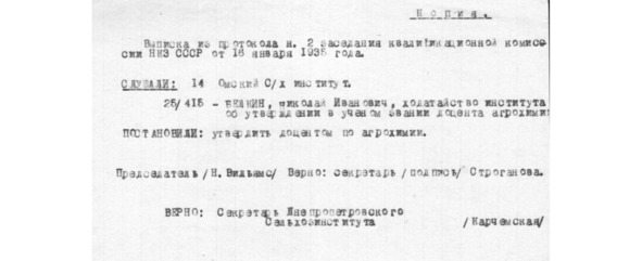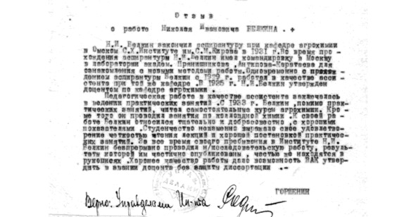 Дана настоящая справка доценту Омского Института Сельского хозяйства им. С. М. Кирова Белкину Николаю Ивановичу в том, что он утвержден в ученом звании доцента Государственной Квалификационной комиссией НКЗ СССР 15-го января 1935 г. за №24—415 и представлен 22 ноября 1935 г. за №1—0 в Высшую Аттестационную комиссию Всесоюзного комитета по делам Высшей школы при СНК СССР к утверждению в ученой степени кандидата наук без защиты диссертации.
