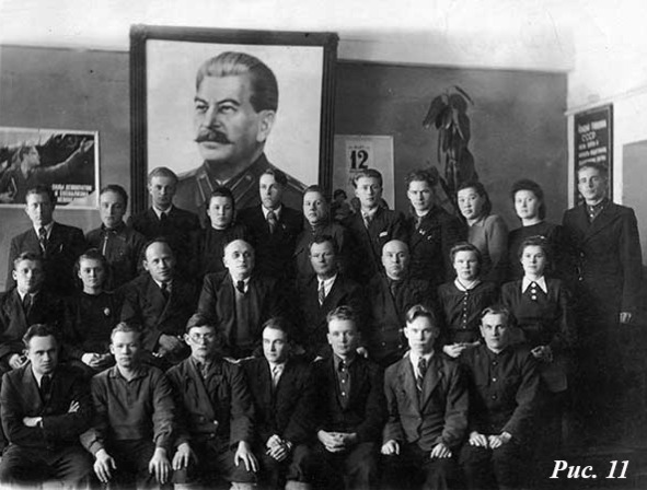 Ещё одна фотография того же года (фото 11). На обороте надпись: «Доценту Белкину Николаю Ивановичу от студентов 1-й группы 3-го курса агрономического факультета ЯСХИ». Снова в центре – Н. И. Белкин. Справа от него, вероятно, С. П. Плетюхин, слева – А. П. Красинский, далее – вероятно, Е. А. Сокольников. Некоторые студенты ещё в гимнастерках, другие – в пиджаках и даже с галстуками. Интересно, что двое в первом ряду – в валенках: видны заправленные в валенки брюки. На плакате с левой стороны снимка вблизи портрета Сталина призыв: «Силы демократии и социализма непобедимы!»