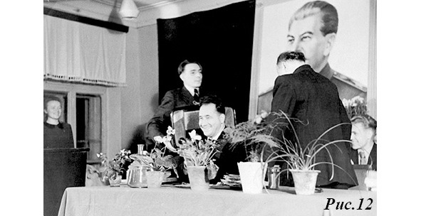 Представления о жизни института дадут нам и фотографии с торжественного собрания 26 ноября 1950 года, на котором профессору Алексею Петровичу Красинскому вручают ценный подарок: радиоприемник (рис. 12 и 13).