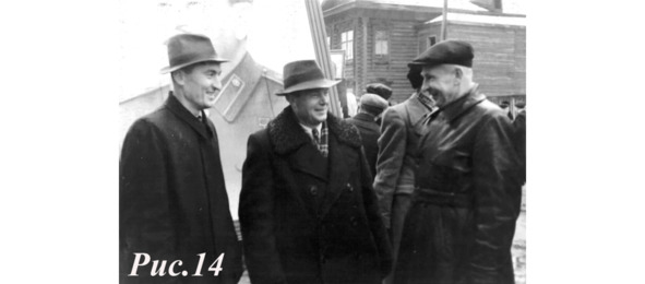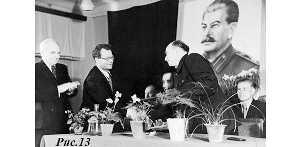 Узнаю модель: это радиоприемник «Балтика», один из самых распространенных в те годы. «Распространенных» не означает, что он был в каждой семье: далеко не в каждой! Должен сказать, что по своей ценности радиоприемник был просто-таки ошеломительным подарком! Уж и не знаю, в связи с чем, так щедро был награжден проф. Красинский (живший с нами в одном доме, во втором подъезде). Вручает приемник, видимо, А. В. Басов – о нем рассказ впереди. В центре стола президиума сидит улыбающийся директор Александр Архипович Анисимов, по левую от него руку спиной к нам привставший для получения подарка проф. А. П. Красинский. На другом фото с того же собрания (рис.13) ему пожимает руку наш отец – Н. И. Белкин. Он улыбается и выглядит молодо и задорно, на нем круглые – по моде тех лет – очки и вполне ещё густая шевелюра: и то сказать – ему здесь всего-то 48 лет! Слева – проф. А. И. Круглов.