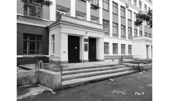Институт с момента создания разместили в типовом 4-этажном здании средней школы в доме №103 по ул. Володарского. В этом здании разместилось все: и администрация, и учебные аудитории, и лаборатории и даже небольшое общежитие. Сейчас в этом здании расположился факультет архитектуры и дизайна Ярославского политеха (технического университета). На современной фотографии (рис.9) – вход в здание; вдалеке виден и второй такой же вход. Раньше всё выглядело несколько иначе: перед входами была более широкая площадка, слева и справа от входов на постаментах были установлены большие шары. В таком же точно здании на параллельной улице располагалась и наша школа №44, о которой речь впереди. У нее тоже были декоративные шары у входа, но и там они не уцелели.
