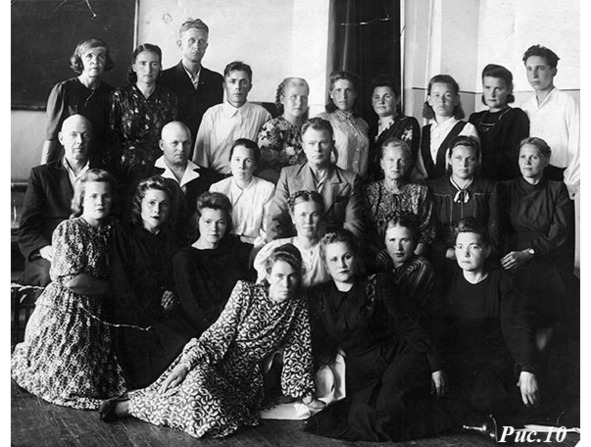 Начну с фотографии, сделанной, вероятно, около 1950 года (фото 10). В центре – отец, Н. И. Белкин, его окружают преподаватели и студенты. Никого из них я, к сожалению, опознать не могу, но фото мне представляется ценным из-за его способности донести до нас атмосферу времени, рассмотреть детали интерьера, выражения лиц, праздничную одежду и прически у женщин и девушек.