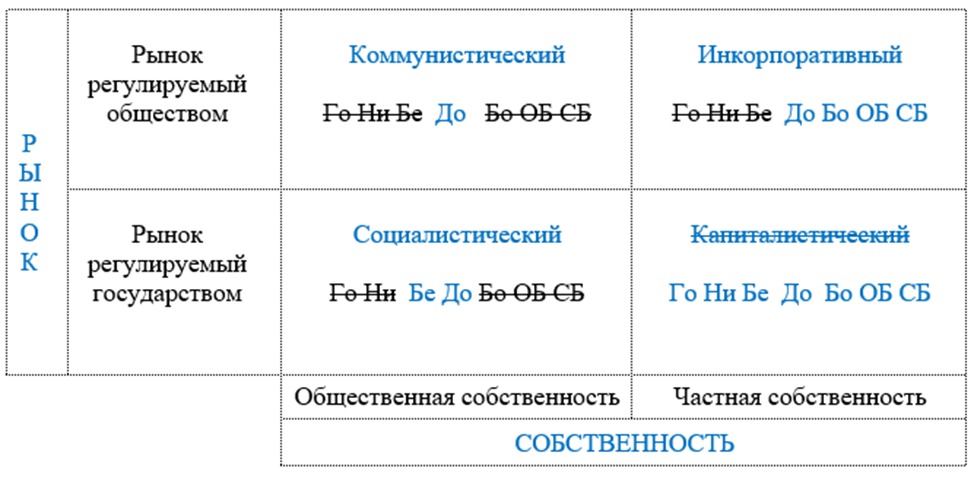 Название институциональной матрицы хозяйствования определяет «название типа общества»: социалистическое общество, капиталистическое общество, инкорпоративное (некапиталистическое) общество, коммунистическое (несоциалистическое) общество и другие.