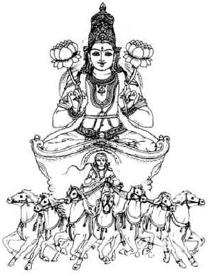 Ригведический Сурья описывался как «прекраснолетящая птица» или как «передвигающийся на колеснице, в которую запряжены одна, семь или много быстрых и сильных коней.