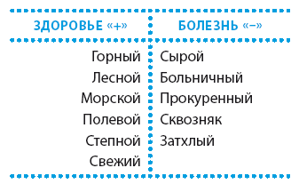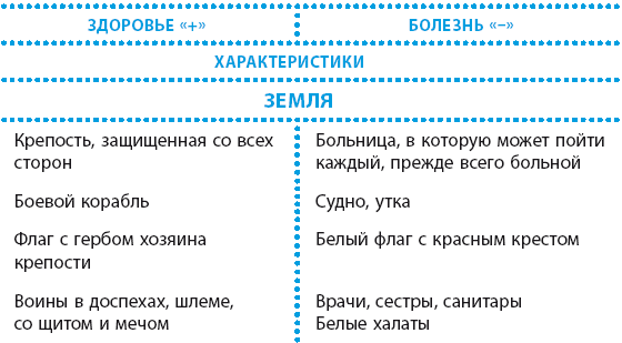 Для удобства восприятия я все понятия внес в таблицу, в которой с левой стороны перечислены ассоциации, относящиеся к здоровью (они имеют знак «+»); в правой, противоположной, колонке сведено все, что относится к болезни и имеет знак «—». Стихии характеризуют сначала основные условия здоровья и болезни, а затем их формы и типы.