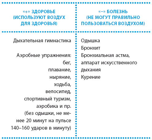 Вы не задумывались, зачем человеку так много дыхательных мышц – основных и вспомогательных? А вообще вы знаете, что такие есть? Я спрашивал пульмонологов – специалистов по лечению хронических обструктивных болезней легких (ХОБЛ), то есть бронхиальной астмы и хронических бронхитов. Не знают. Вернее, не догадываются, что ими можно управлять, поэтому прописывают больным ХОБЛ ингаляторы. Да, они еще рекомендуют своим пациентам и морской воздух, и горный, и… Впрочем, эти больные не умеют пользоваться положительным пространством стихии «Воздух»… И поэтому, даже находясь в горах, в лесу или у моря, держат при себе ингалятор.