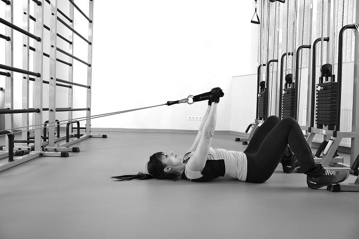 При необходимости отжимания можно заменить упражнениями с эспандером. Для этого нужно взять в руки эспандер или резиновый жгут и растягивать его перед грудью (это можно делать в положении сидя или лежа, см. фото 4а; 4б). Можно также закрепить эспандер сверху и делать движения типа подтягиваний (см. фото 5а; 5б).