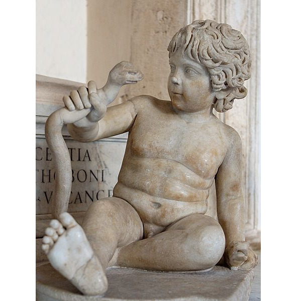 Когда исполнилось детям восемь месяцев, решила Гера погубить сына Зевса и послала к детской колыбели двух змей. Однако малыш Алкид поднялся с ложа и, схватив обоих гадов, задушил их голыми руками. Так стало понятно, кто из братьев полубог.