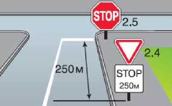 Табличка 8.1.2 «Расстояние до объекта» со знаком 2.4 «Уступи дорогу» указывает расстояние от знака 2.4 до перекрестка в случае, если непосредственно перед перекрестком установлен знак 2.5