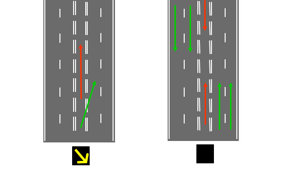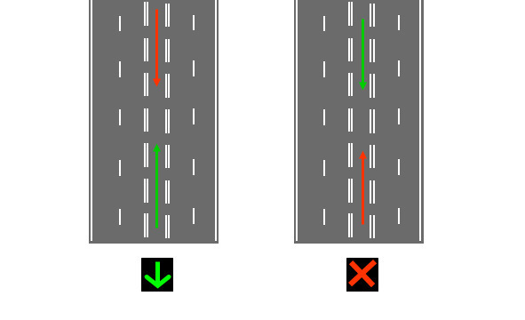 Существуют два типа реверсивных полос, первая полоса выделена двойной прерывистой с обоих сторон.