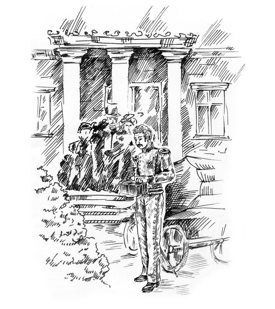 Cойдя с брички, Хитрово-Квашнин одернул синий двубортный мундир, поправил орден Св. Георгия, разгладил панталоны и, убедившись, что носки сапог сияют блеском, вручил поводья подбежавшему лакею, а саквояж – дворецкому. С тростью в одной руке, бумажной коробкой в другой, подошел, слегка прихрамывая, к крыльцу, поднялся по ступеням и расцеловал сестру. Обнял затем племянниц, 18-летнюю крестницу Аглаю и 15-летнюю Анастасию, и, наконец, обменялся рукопожатием с хозяином, среднего роста худощавым сероглазым шатеном в длинном архалуке, свободного кроя брюках и лакированных домашних туфлях.