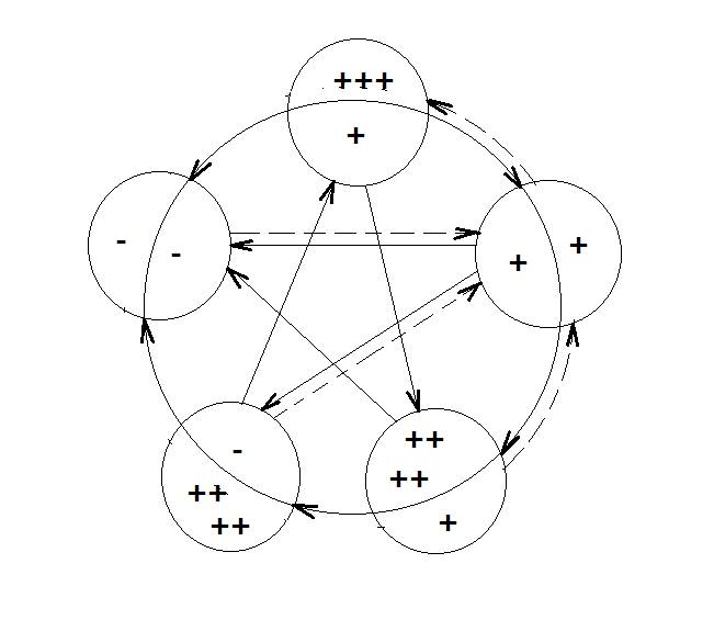 Чтобы рассмотреть циркуляцию энергии пяти стихий в теле человека, рассмотрим диаграмму, указанную на рисунке выше.