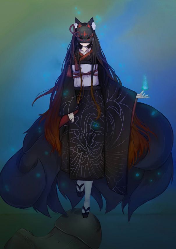 Гладь воды была абсолютно спокойна, лишь одна-единственная деталь то и дело вызывала волнение на поверхности: длиннющая бедренная кость, на конце которой на одном носочке стояла лиса. Кицунэ, облачённая в красочную ало-чёрную юкату с изображением хризантем. Роскошные длинные, почти до пят, волосы чернющего оттенка с кроваво-красными прядками, лисьи ушки с мехом того же окраса, не считая островков белого пушка внутри. Лисья маска скрывала лицо девушки и слегка приглушала её голос.