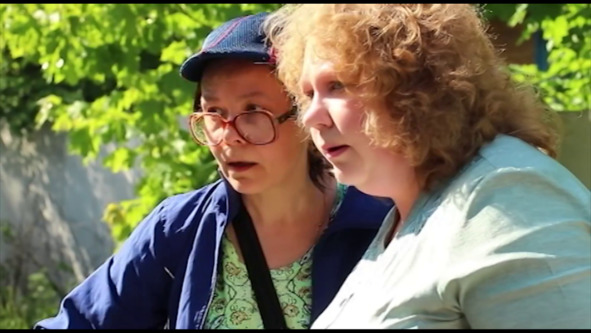 Бабка Феофанова и Петровна видят, как из заброшенного старого дома выходит Харитонов.