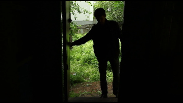 Харитонов, шатаясь, проходит по двору и останавливается на крыльце покосившегося от времени заброшенного деревянного дома с окнами, наглухо забитыми досками.