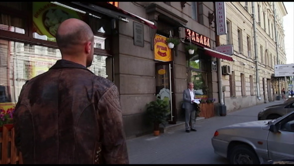 Выйдя из кафе, Харитонов смотрит по сторонам. Ёжится от холода.