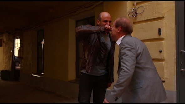 Второй и третий парни наскакивают на Харитонова, но тот отходит в сторону. Отчего парни пролетают мимо, стукнувшись друг о друга. Этого времени хватает Харитонову, чтобы обезвредить ещё одного нападавшего. Для этого он снова использует указательный палец. Удар в затылок заставляет и второго парня застыть на месте.
