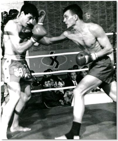 Против удара правой ногой боксер делает шаг вперед-вправо, тем самым смягчая прием удара в туловище, и захватывает левой рукой ногу противника либо снаружи, принимая удар в туловище, либо изнутри, принимая удар предплечьем.