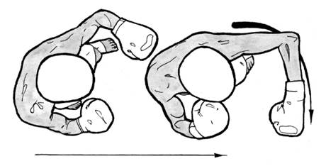 Удар сбоку правой под шаг (полувыпад) левой ногой будем считать основной техникой. Движение ног здесь такое же, как в прямом ударе под шаг левой: боксер делает шаг вперед или вперед-влево левой ногой, причем в момент приземления несколько сгибает ее. Уже в момент толчка носком правой ноги боксер начинает вращать тело в правом тазобедренном суставе, а правую руку, согнутую под прямым углом, направляет по дуге окружности или параболы к цели.