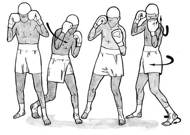 Если нужно сблизиться с противником, вес тела следует перенести на левую ногу. Тогда вращение туловища произойдет в левом тазобедренном суставе. Если же нужно отойти от противника, боксер вес тела перемещает на правую ногу, и вращение происходит в правом тазобедренном суставе.