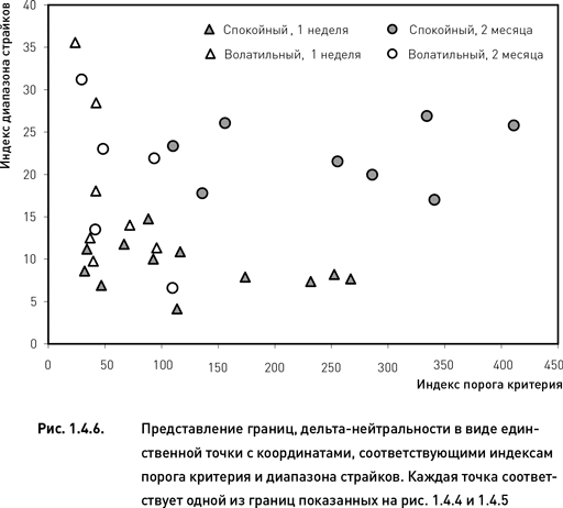 Применим эту методику к границам дельта-нейтральности, представленным на рис. 1.4.4 и 1.4.5. Индексы порога критерия и диапазона страйков показаны на рис. 1.4.6. Здесь каждая граница критерия, представленная на рис. 1.4.4 и 1.4.5, в виде изолинии, обращена в единственную точку, являющуюся своего рода центром области, отделенной границей дельта-нейтральности. Представление границы в виде единственной точки, безусловно, снижает объем информации, содержавшейся в исходных данных. Тем не менее почти все заключения, сделанные ранее на основании визуального анализа рис. 1.4.4 и 1.4.5, можно сделать, проанализировав данные, представленные на рис. 1.4.6.