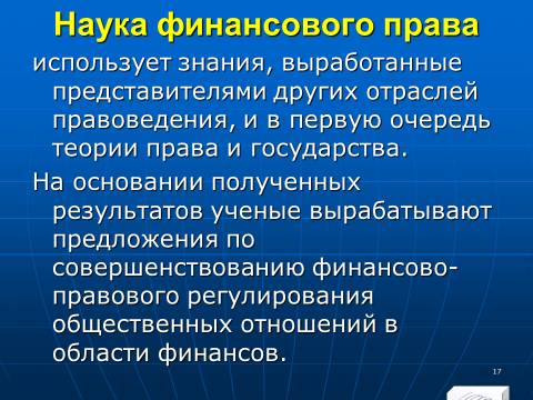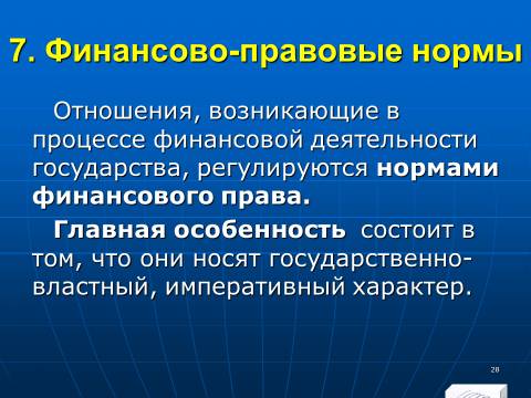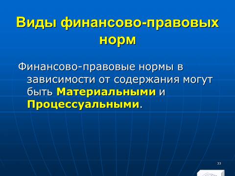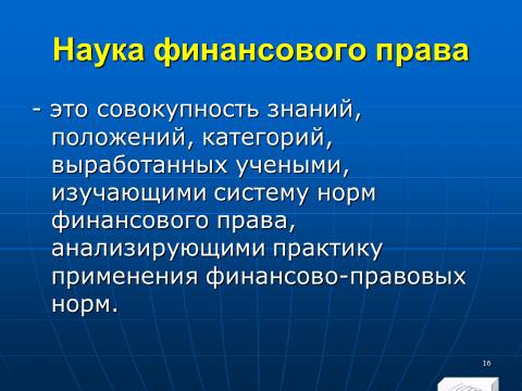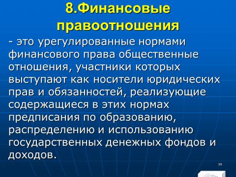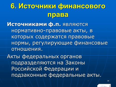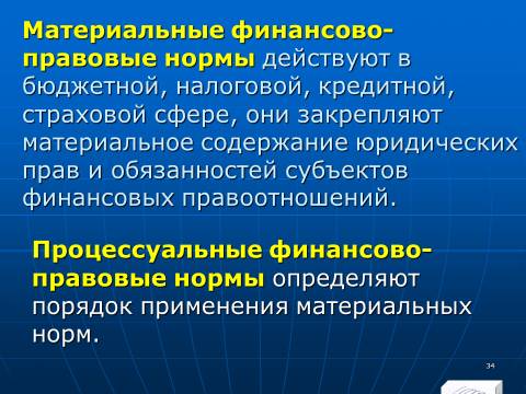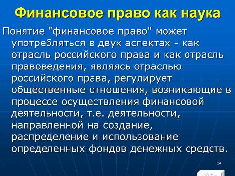 1. совокупность финансовых норм, регулирующих общественные отношения, которые возникают в процессе образования, распределения и использования денежных фондов (финансовых ресурсов) государства и органов местного самоуправления, необходимых для реализации их задач