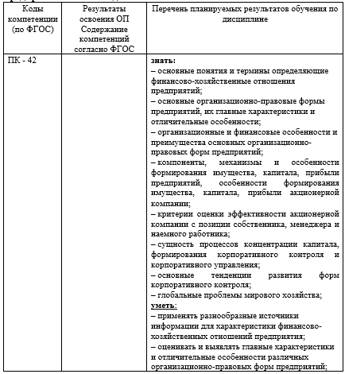 2. Базовый уровень: предполагает формирование компетенций ПК-42 на более высоком уровне. Формируются системные знания – организационные и финансовые особенности и преимущества основных организационно-правовых форм предприятий; компоненты, механизмы и особенности формирования имущества, капитала, прибыли предприятий, особенности формирования имущества, капитала, прибыли акционерной компании; классифицировать и применять организационные и финансовые преимущества основных организационно-правовых форм предприятий;