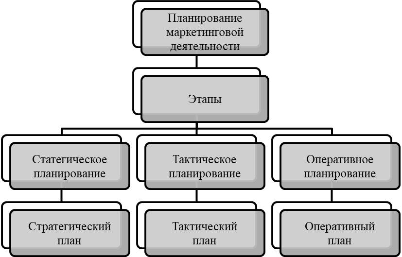 В процессе планирования маркетинговой деятельности на предприятии можно условно выделить три этапа (рисунок 1.4). Стратегическое планирование маркетинговой деятельности на предприятии является высшим менеджментом предприятия.