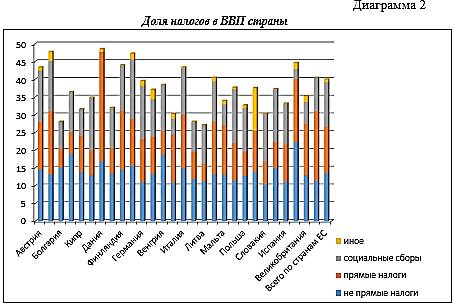 Согласно данным Евростата за 2015 год1 уровень доли налогов в ВВП стран ЕС колеблется от 28.1% до 45%. Наибольшие поступления составляют косвенные налоги, при этом социальные взносы и прямые налоги составляют незначительную часть в налогообложении.