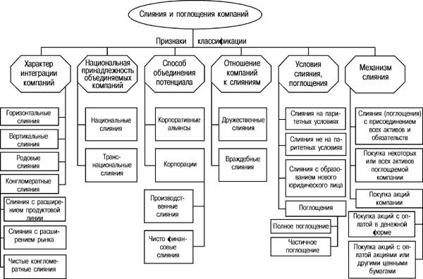 В современном корпоративном менеджменте можно выделить множество разнообразных типов слияния и поглощения компаний. Считаем, что в качестве наиболее важных признаков классификации этих процессов можно назвать (см. рис. 1):