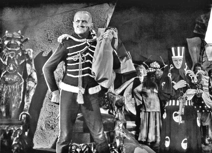 А Георгий Францевич, вдоволь напугавшись, решил, что ирония, пожалуй, лучше. Его следующие персонажи более фольклорны, карикатурны. Это и болотный министр Квак («Марья-искусница»), и придворный Шут («Новые похождения Кота в сапогах»), и Чудо-Юдо («Варвара-краса, длинная коса»), и даже Черт («Вечера на хуторе близ Диканьки»), в легком костюмчике которого актер снимался при сорокоградусном морозе.
