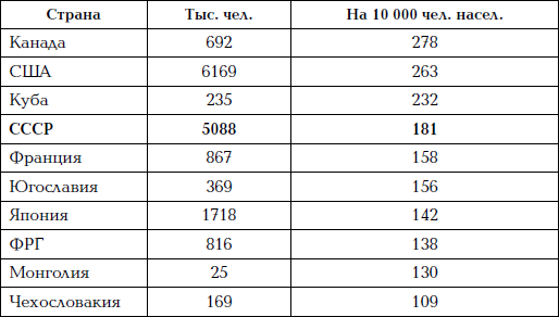 Абсолютно первое место в мире, включая удельный показатель, мы занимали в 1986 году и по числу больничных коек – 130 единиц на 10 тысяч населения. На втором месте по удельному показателю была Япония, на третьем – ФРГ. Англия занимала десятое место, США – тринадцатое. При этом в капиталистических странах стоимость медицинского обслуживания постоянно росла (в США на 63 % за 1981–1986 гг.).