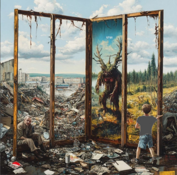 Григорий сидел на городской свалке солнечного города, созидающего мирный атом… и отчуждённо наблюдал, как по ту сторону зеркала знакомое распростёртое тело, смачно чавкая, пожирало воплотившееся мифологическое мансийское существо – болотный дух Комполен, а рядом в безмолвном почтении замерла кровожадная армия менквов.